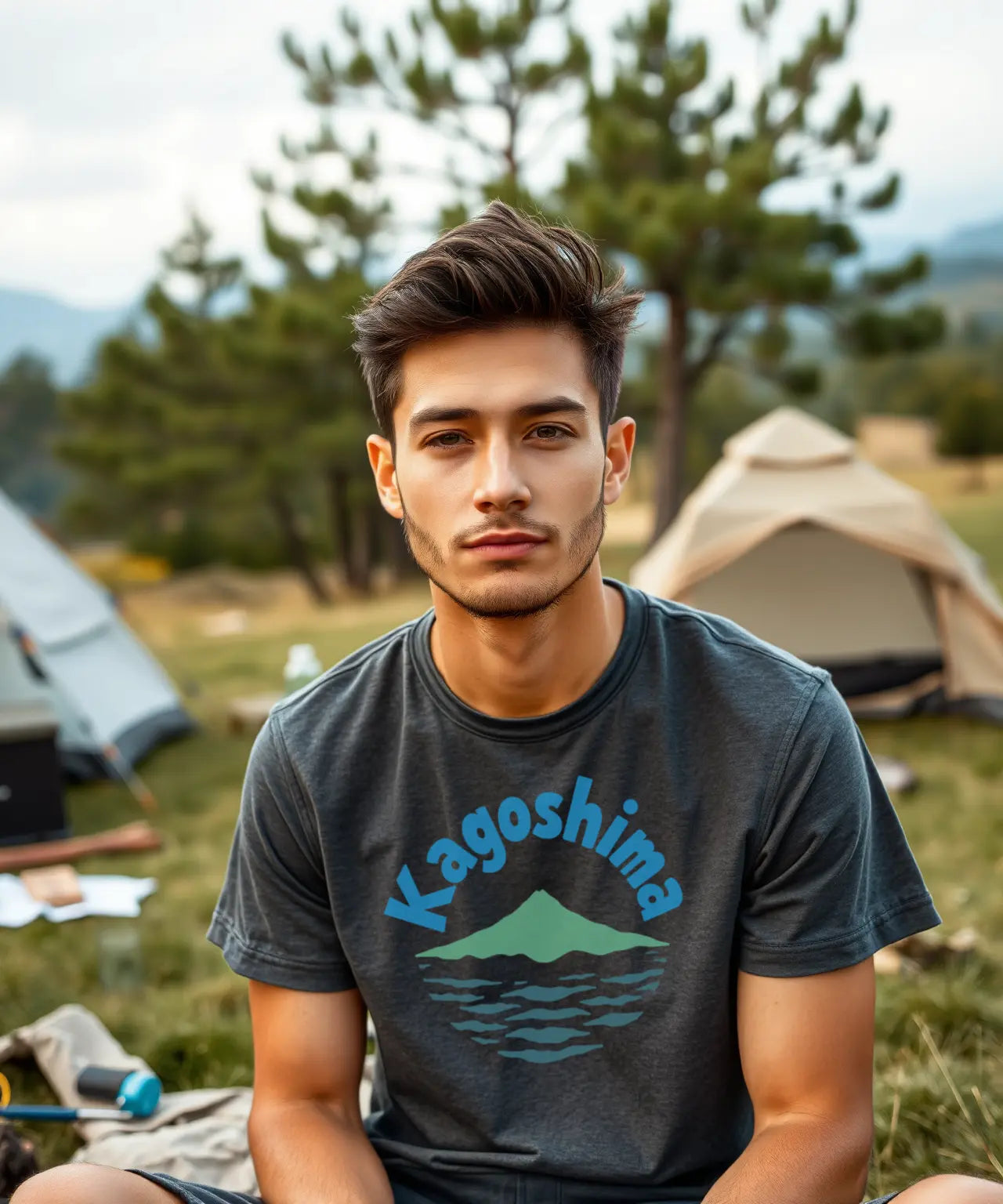 Celebrate Kagoshima's stunning landscapes with a minimalist design featuring a reflected mountain and coastal views, capturing Japan's southern prefectures charm. 🎨🌊✨