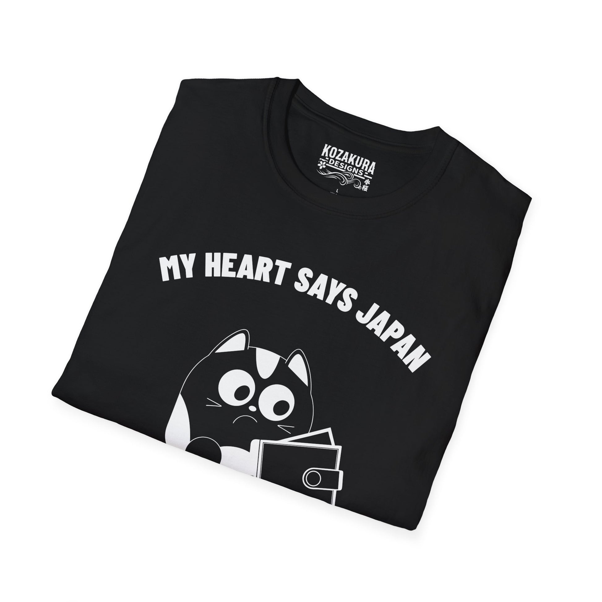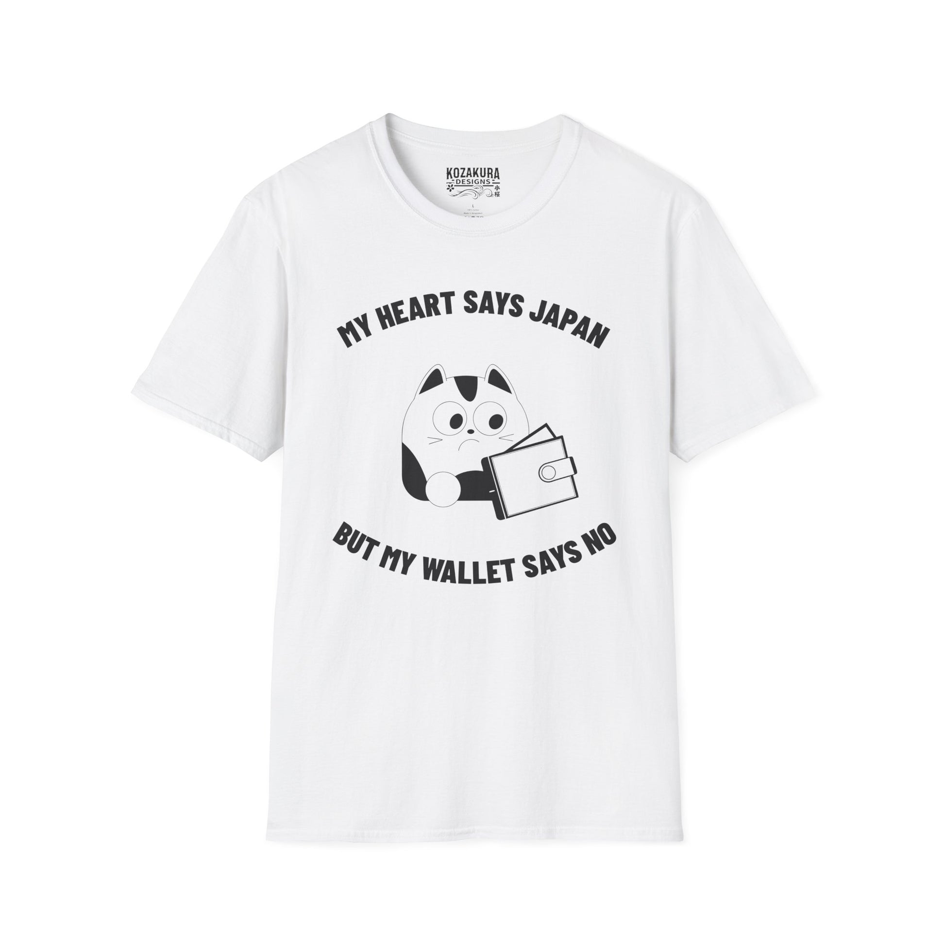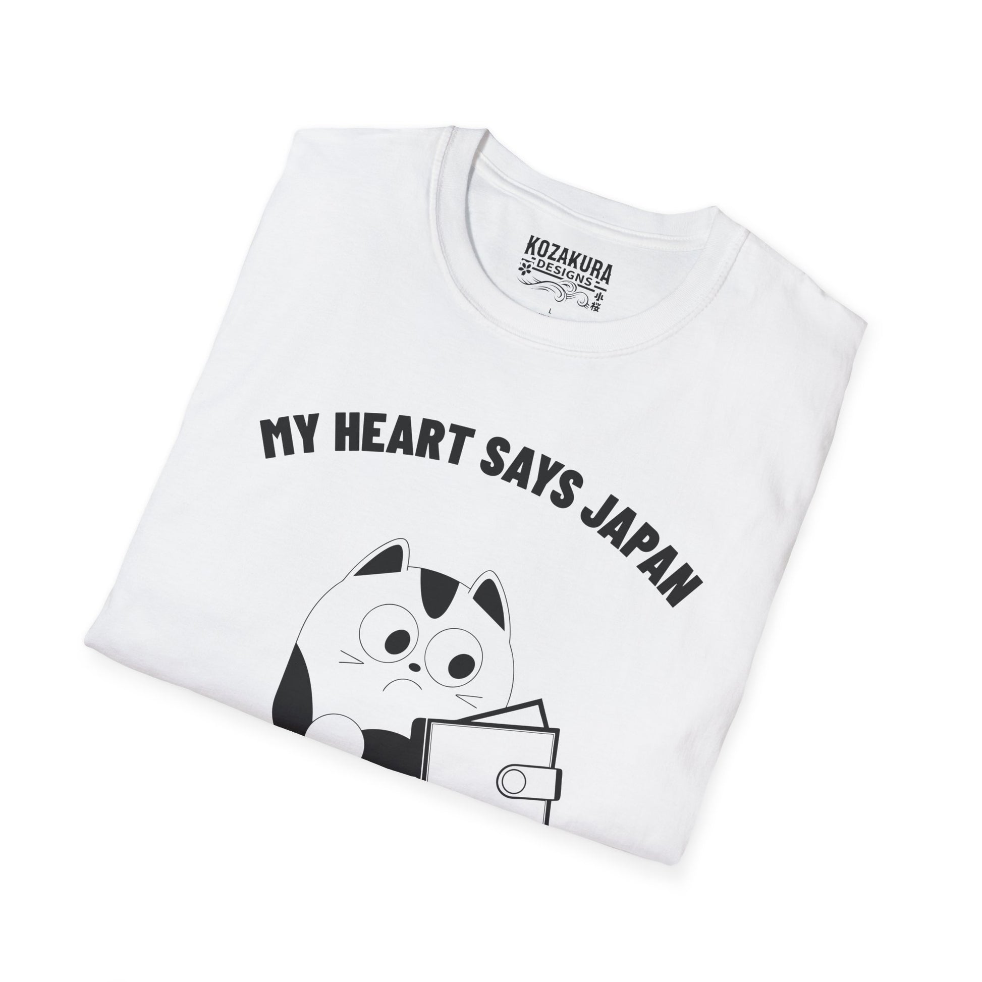 This T-Shirt features a quote 'My heart says Japan but my wallet says no' for those who love Japan but are on a budget. It is perfect for someone who enjoys casual, comfortable style and wants to express their love for Japan. Ideal for travelers, Japan enthusiasts, and budget-conscious individuals. Suitable for casual wear, travel, Japanese cultural events, and everyday occasions.